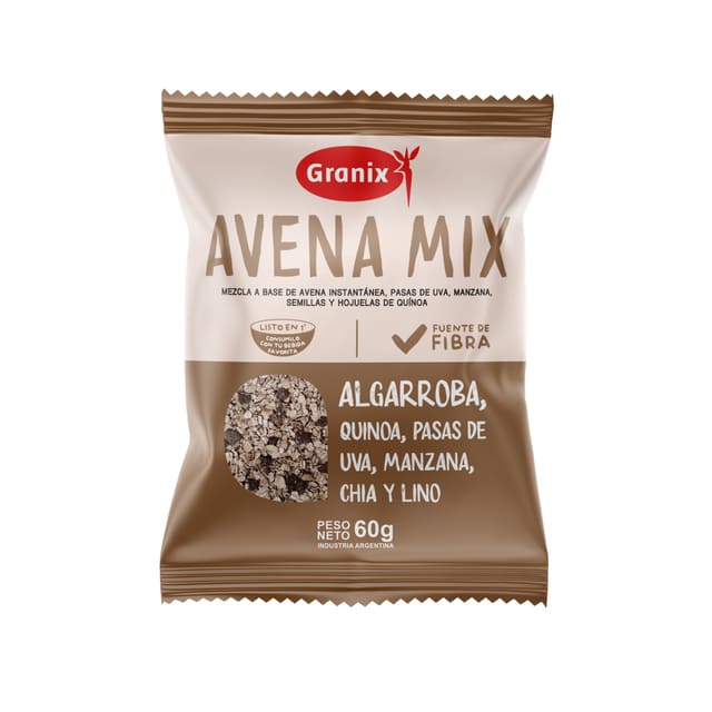 Avena Mix es libre de sellos y está pensada para quienes buscan alimentarse mejor sin perder tiempo: se prepara en menos de un minuto con leche, bebida vegetal o yogurt, y también puede consumirse como avena trasnochada.