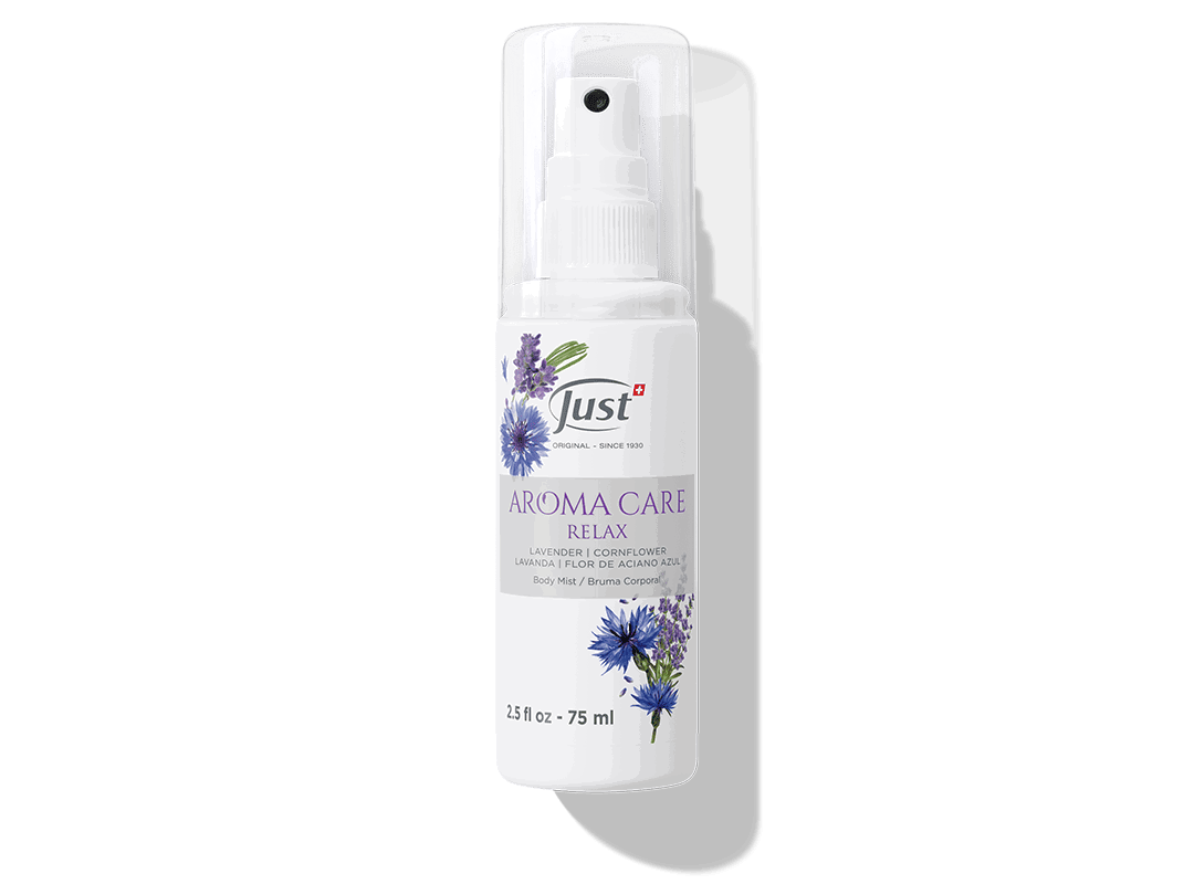 La Bruma Corporal Aroma Care Relax de Just es un producto de aromaterapia diseñado para promover el bienestar emocional y la relajación profunda. Se presenta en un envase de 75 ml y está formulada principalmente con aceites esenciales de Lavanda y Aciano Azul.